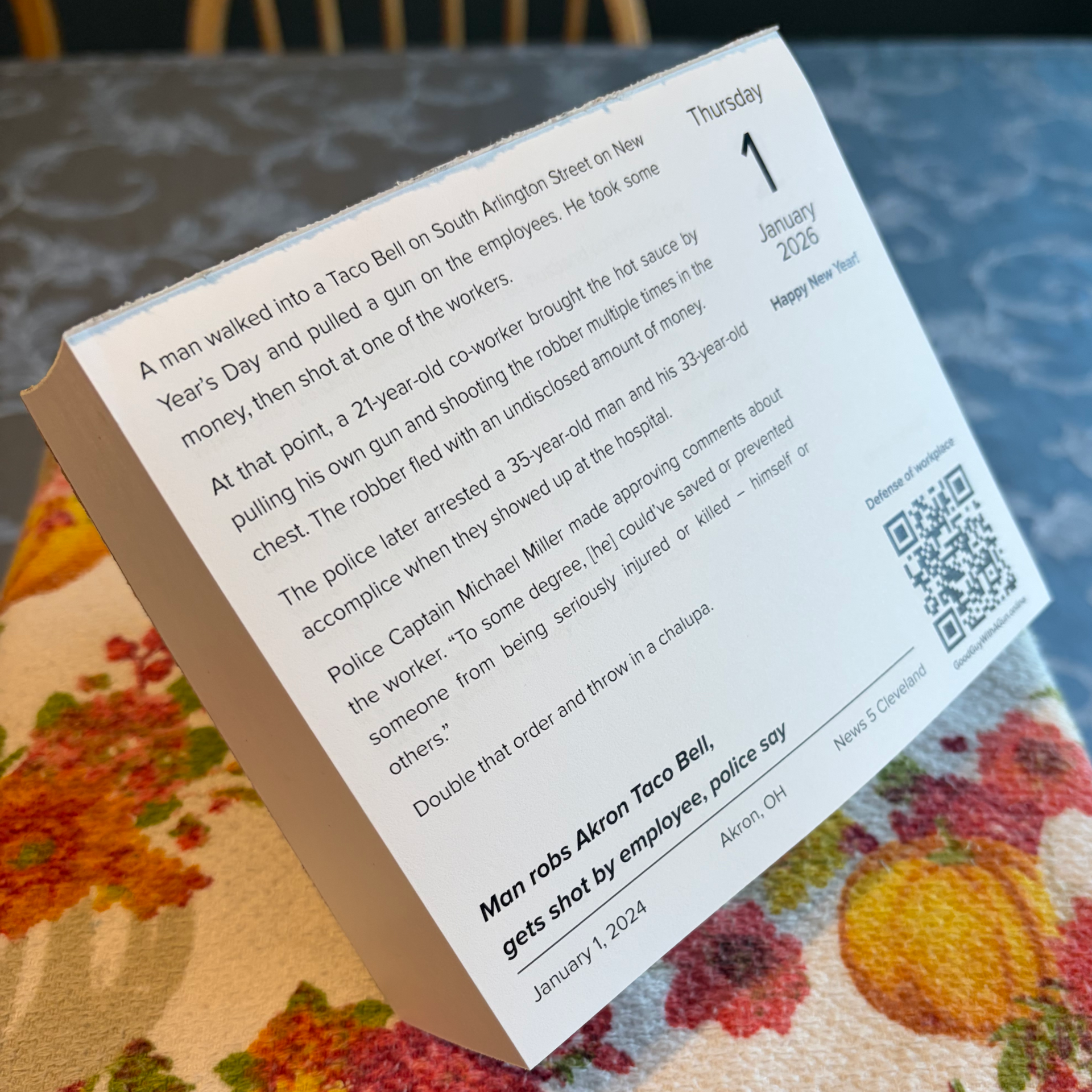 The only desk calendar that features summaries of Good Guy with a Gun news stories, each one backed up with a QR code that links to the article on which it's based. Get more detail and see photos.